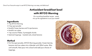 Mix 1 heaped teaspoon (4g) of our MYCO Morning blend with 200ml of cold water, smoothie, juice, or any drink of your choice. For optimal results, use a hand whisk or blender to ensure thorough mixing. You can also incorporate the powder into a breakfast bowl or any food.